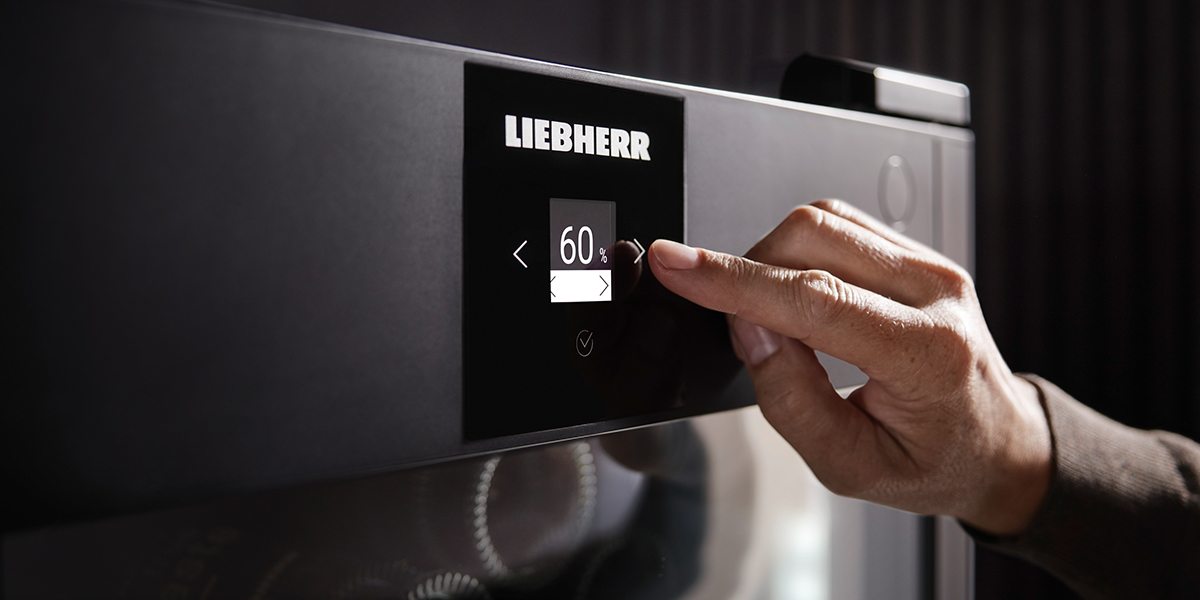 Liebherr-Weinkühlschränke bieten die ideale Luftfeuchtigkeit durch eine ausgeklügelte Kombination aus Kältesystem, der Steuerung der Luftzirkulation im Gerät und Holzborden, die als Wasserspeicher fungieren. Mit HumiditySelect kann die Luftfeuchte in zwei Stufen verstellt werden: Standard oder Hoch. Bei Modellen mit HumidityControl erlaubt die Funktion ein Einstellen der gewünschten Luftfeuchte im Bereich von 50 % bis 80 % RH* und zeigt den Ist-Wert permanent an. Fällt der Wert auf unter 50 % RH* weist das Gerät darauf hin.