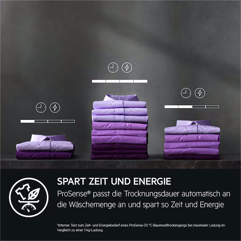 - Elektronisch gesteuerte Programme: Der Wäschetrockner misst konstant die Feuchtigkeit der Wäsche und passen die Trocknungszeit daran an. So kann - abhängig von der Restfeuchte - die vorveranschlagte Trockenzeit reduziert werden.